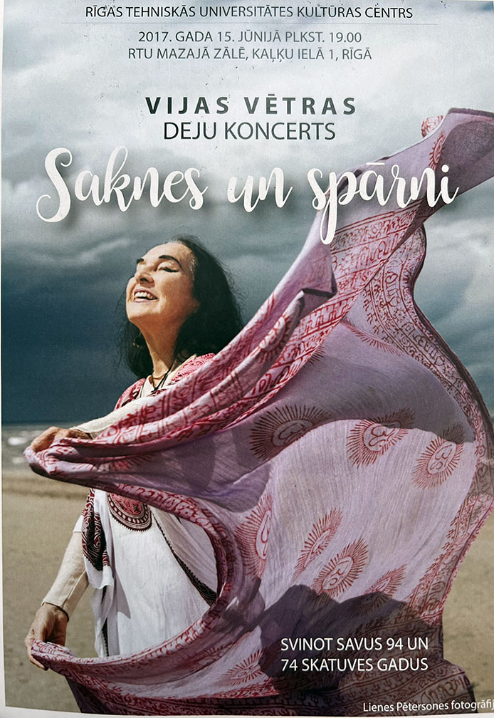 Born in Riga, Latvia, Vētra is an acclaimed classical and contemporary dancer, choreographer and performer of Latvian traditional dance. Vija Vētra is also an Indian classical dancer and a path-breaking creator of the movement of sacred devotional dance in Latvia. During her artistic journey,  Vija Vētra has performed on stages of four continents and countless cities. A patriot of Latvia, she carried the name of her country even when the country was behind the Iron Curtain.