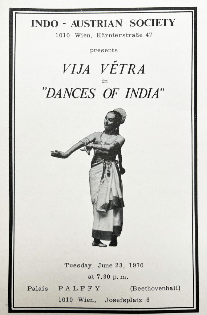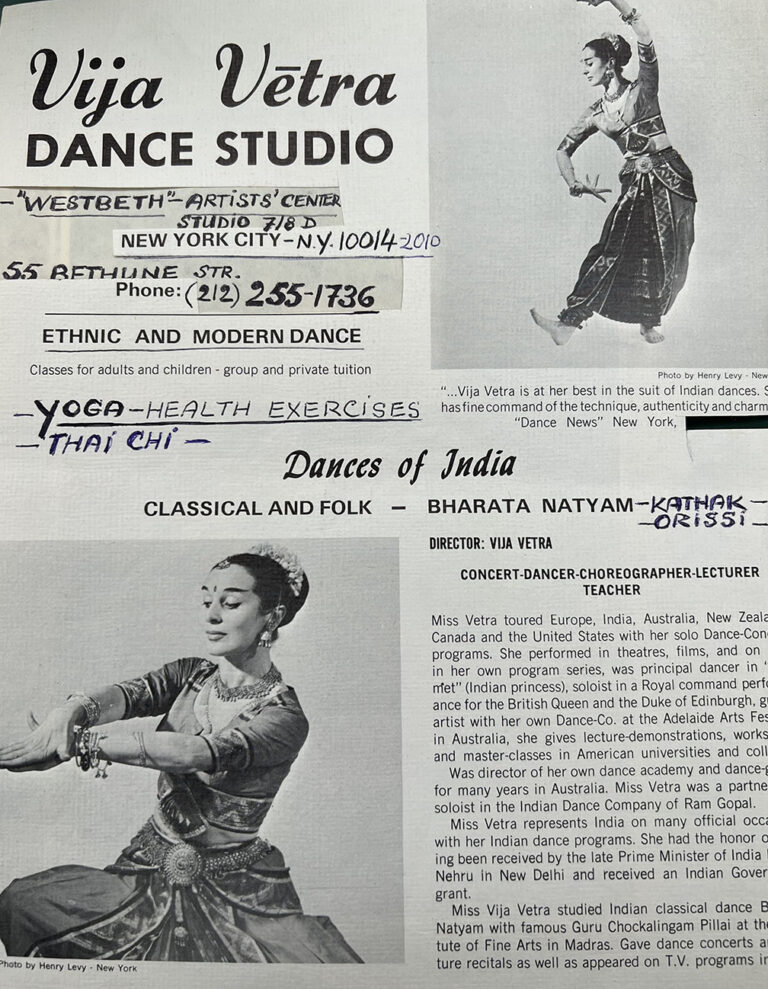 For Vija, dance is her life and single focus. Sacrificing family life, she devoted her life to the pursuit of art. During World War II, she studied at the Vienna Academy of Music and Performing Arts and the Vienna Conservatory Ballet chapter. However, she had to escape as a war refugee to Germany. In 1948, she immigrated to Australia and 1951, opened a dance studio in Sydney. Destiny had other plans for this young artist. While performing in Australia in the 1950s, Vija Vētra was cast as an Indian princess in a musical for the Sydney opera—this was a turning point in her life and the beginning of a life- long passion.